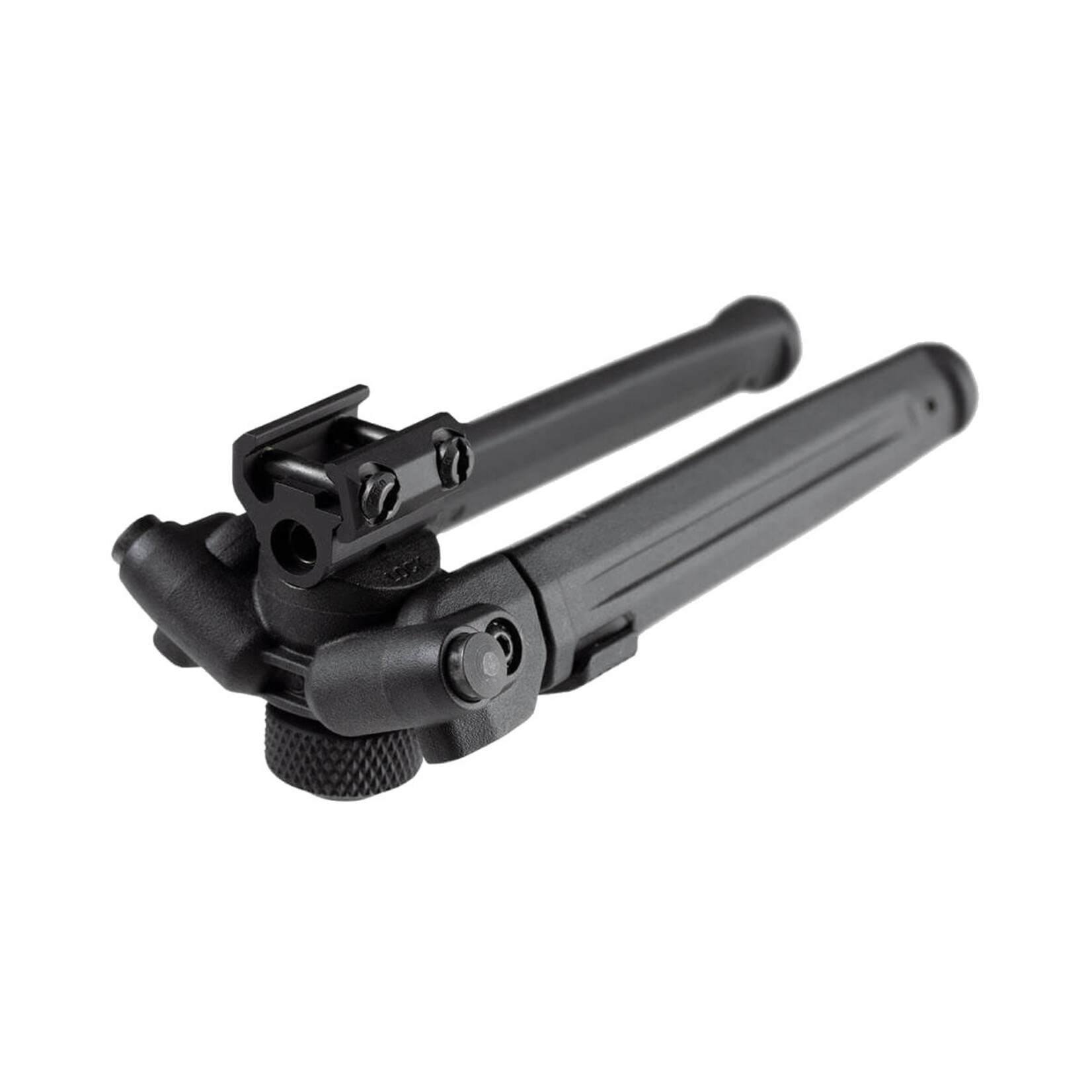Leg extensions slide and lock securely with the push of a button on any of the seven half-inch spaced locking detents. The legs extend 3.5 inches, from 6.8” to 10.3”. An industry-exclusive 50° of total tilt and 40° of total pan are controlled by a glove-friendly knurled tool-less bipod locking knob located between the extended legs. It also has the exclusive ability to lock pan at 0° while maintaining full tilt functionality. Folded, the streamlined housing and legs fit neatly under the barrel and are just under 2.3” deep and 3.3” wide. Anodized surfaces and tight, precision tolerances mitigate squeaks and rattles.